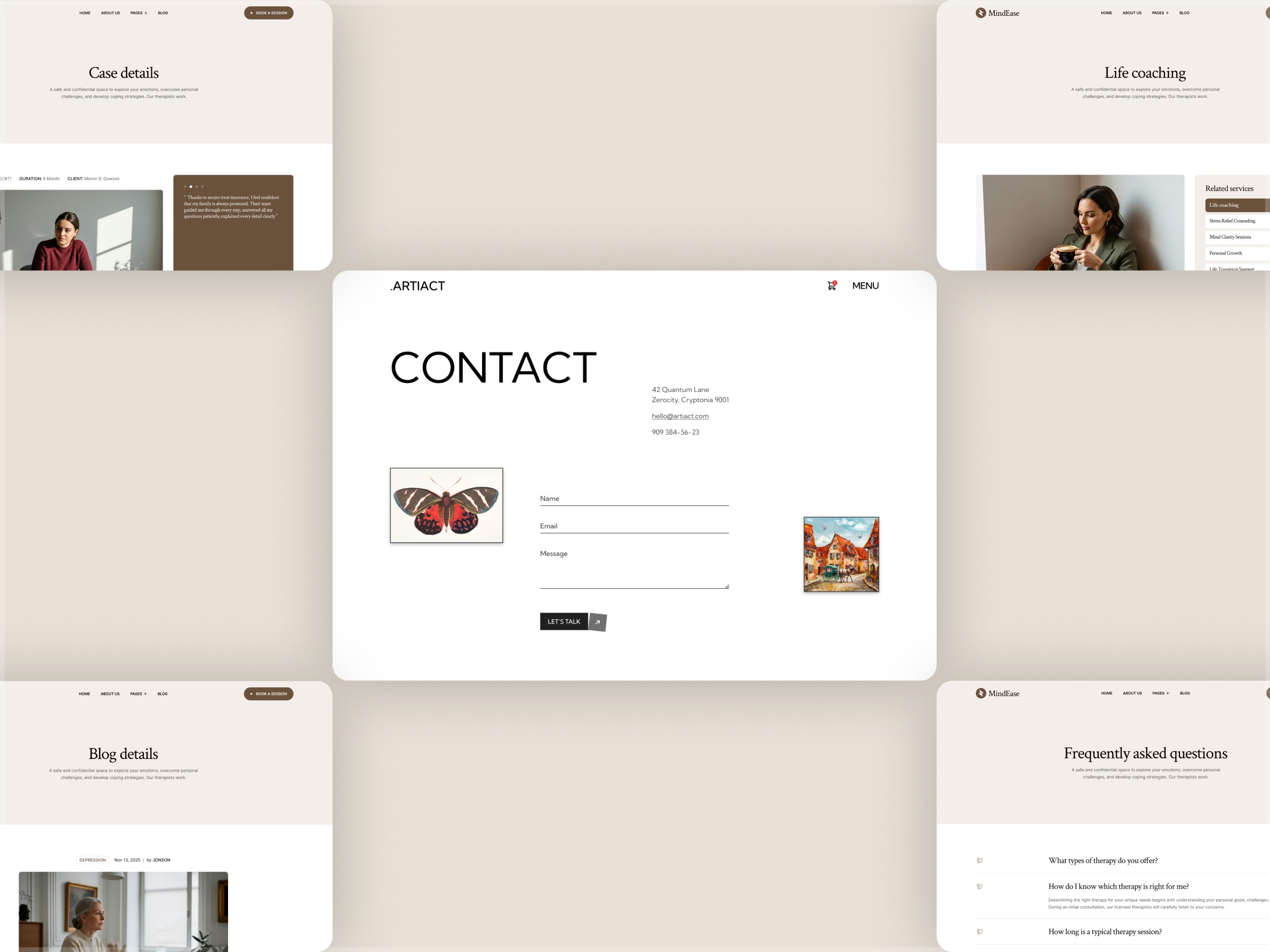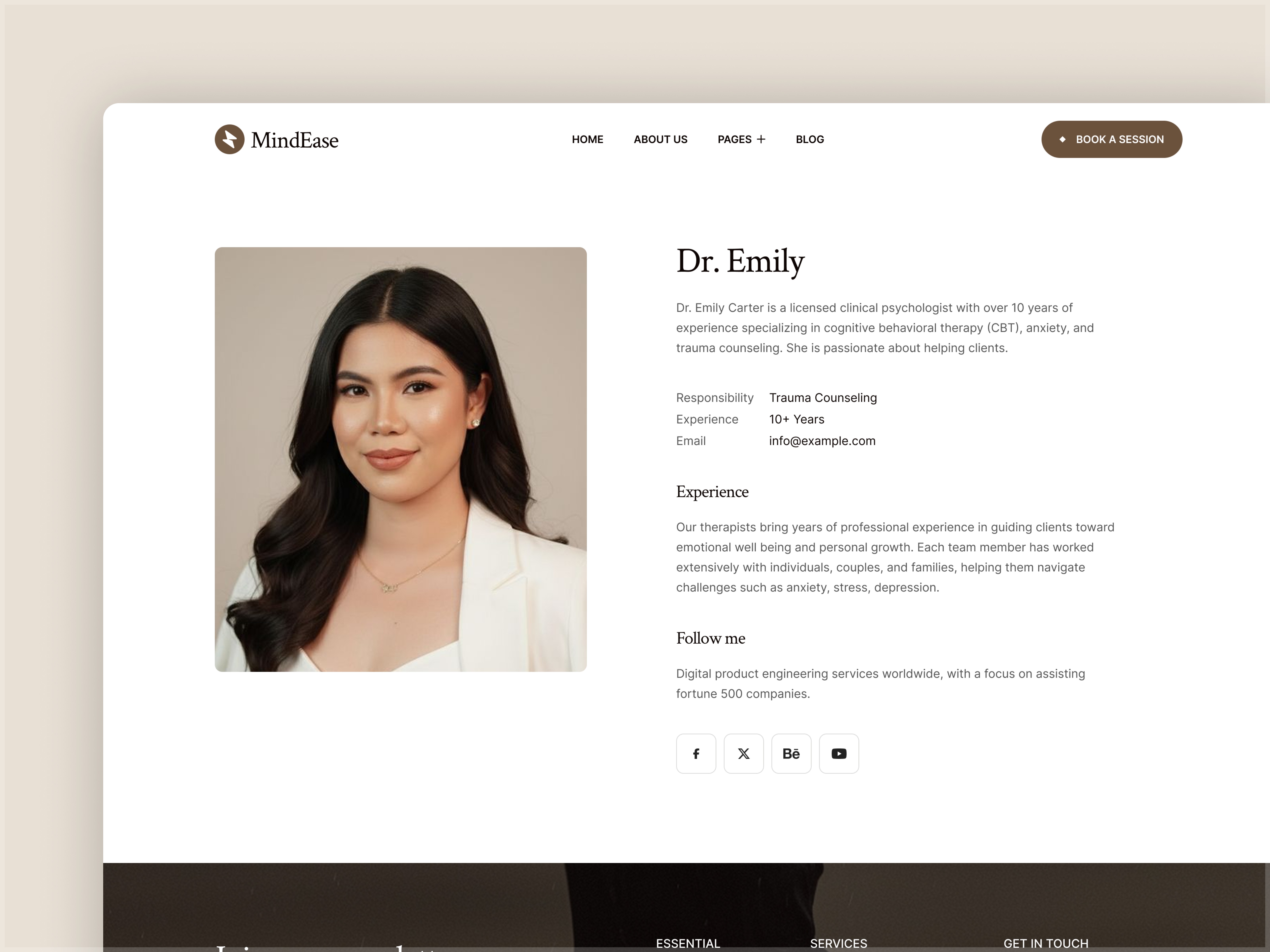 Mindeasee is created for mind therapists, counselors, psychologists, and wellness professionals who want their website to feel reassuring, professional, and easy to navigate. The design focuses on simplicity and emotional comfort, helping visitors feel supported from the very first interaction.