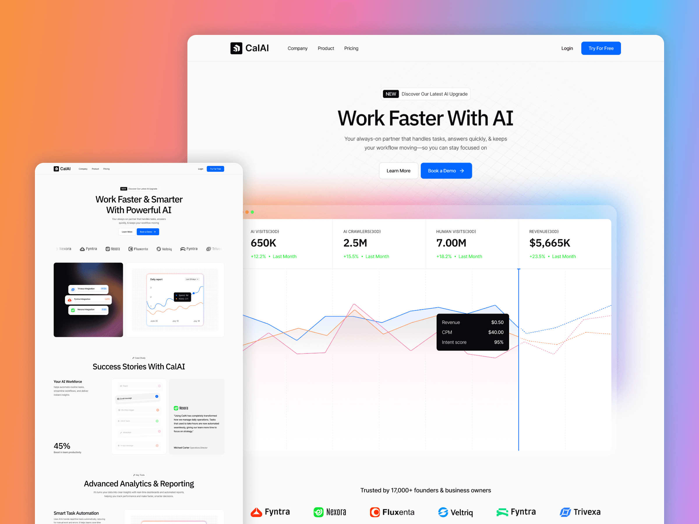 The multi-layout structure gives you flexibility to present your product in different ways, whether you're focusing on features, use cases, or growth stories. Fully responsive and optimized for performance and SEO, Syntro ensures a smooth experience across all devices. Built entirely in Framer, it’s easy to customize and launch—no coding required.