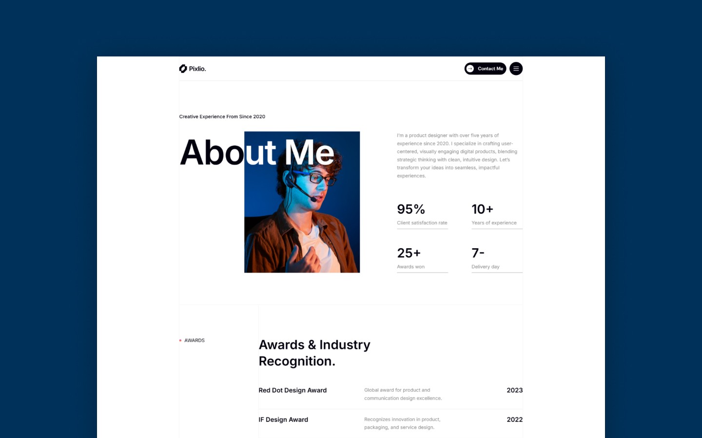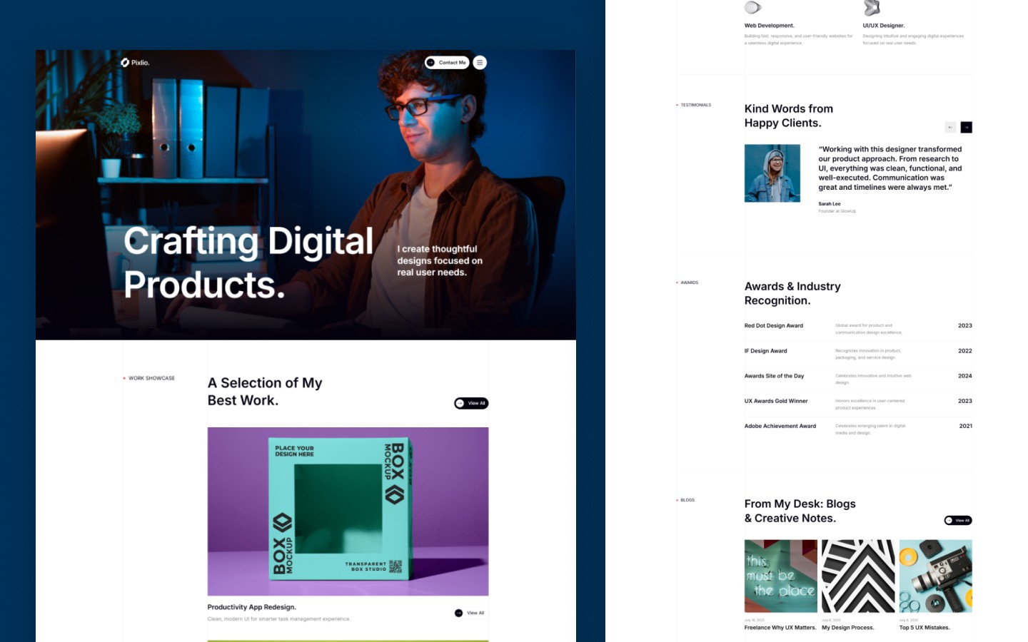 Pixlio is a modern and elegant Webflow template built for personal portfolios. Whether you're a graphic designer, web developer, photographer, writer, or creative professional, Pixlio gives you the perfect canvas to present your skills, projects, and personality. With its minimal yet impactful layout, Pixlio keeps the focus on your work, while intuitive navigation and smooth animations enhance the user experience. Fully responsive and optimized for SEO, the template looks great on all devices and loads quickly. Pixlio also includes CMS support for blogs and project listings, allowing you to update your content easily. It’s simple to customize and adapt to your brand, making it a powerful tool to stand out in your industry.